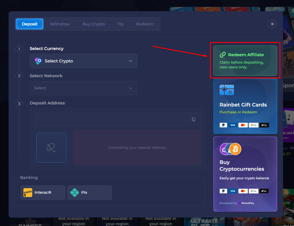 5. Also you can activate affiliate code while depositing funds. Simply head to the deposit section and press the “Redeem Affiliate” button.