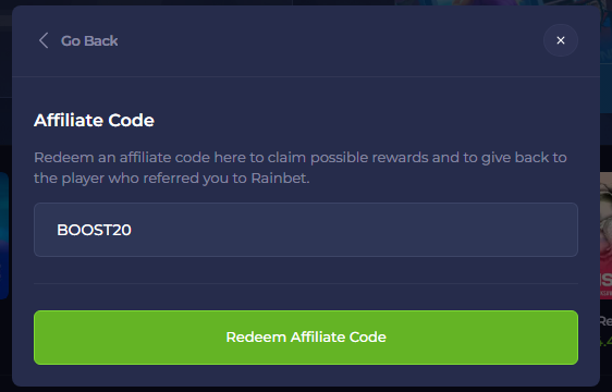 Activating the Rainbet Promo Code “BOOST20” Rakeback Bonus